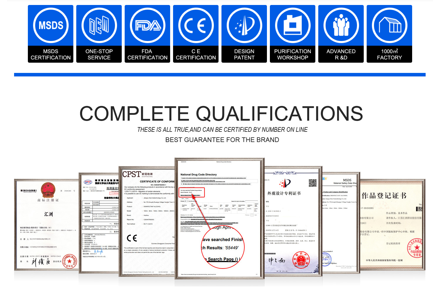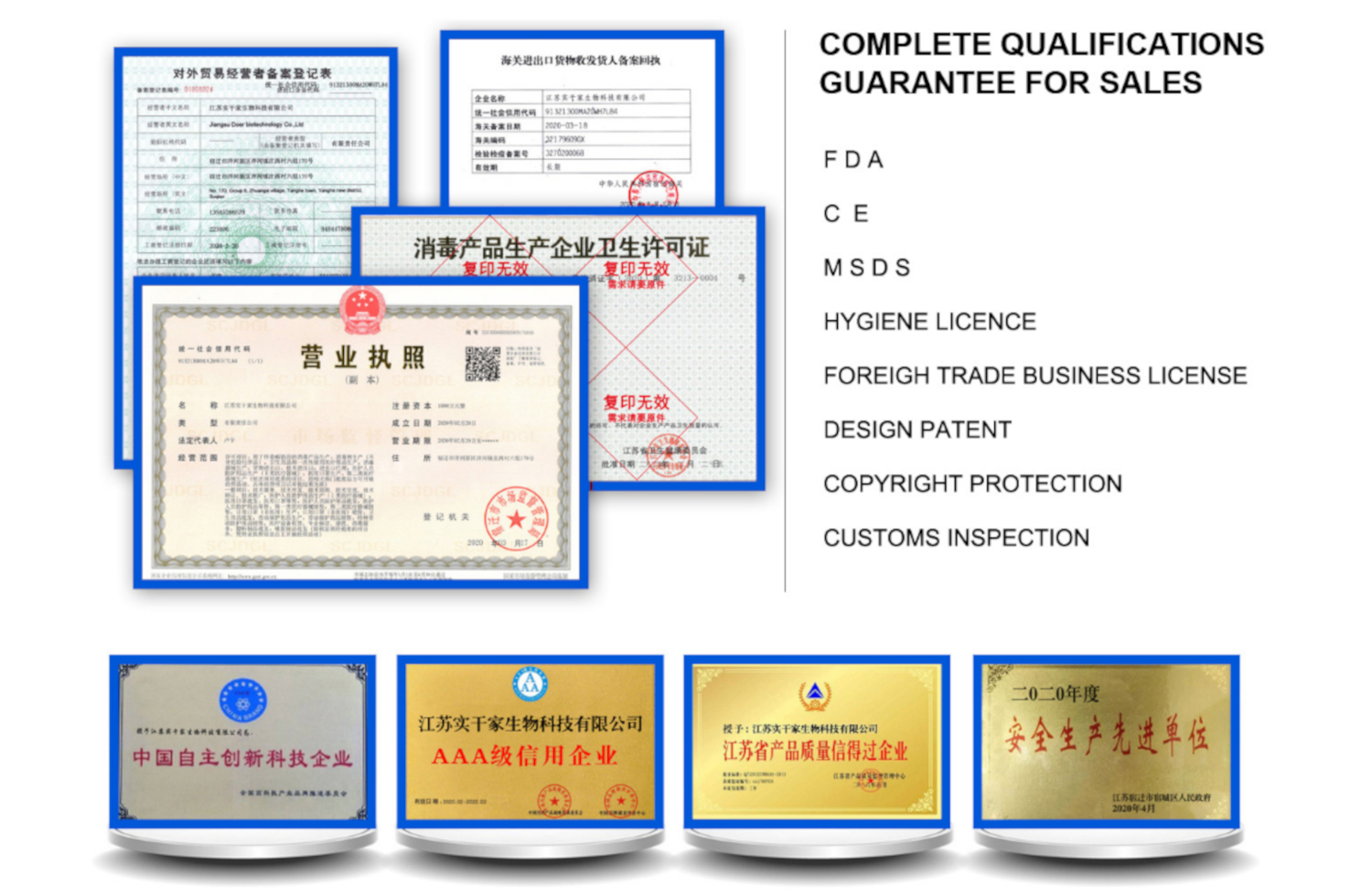 弊社で販売する本製品は、安心・安全・信頼の証である「製品安全データシート(MSDS)」、「アメリカ食品医薬局(FDA)」「欧州基準適合(CEマーク)」の認証を取得しているJiangus Doer Biotechnology社の製品です。