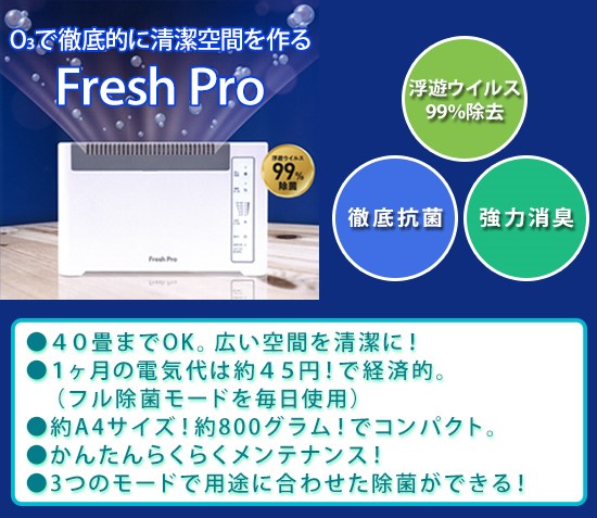 Fresh Pro(フレッシュプロ)は、オゾンで気軽に空間を除菌・消臭し清潔な空間を作ります。