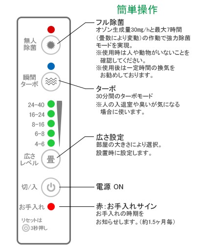 | 無人除菌モード | 外出時などお部屋に人や動物等がいない時に、最大濃度のオゾンでお部屋を徹底的に除菌します。 |